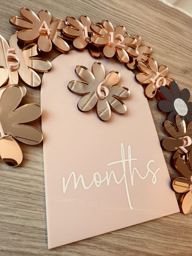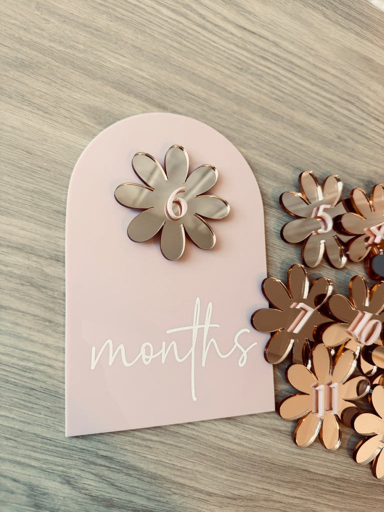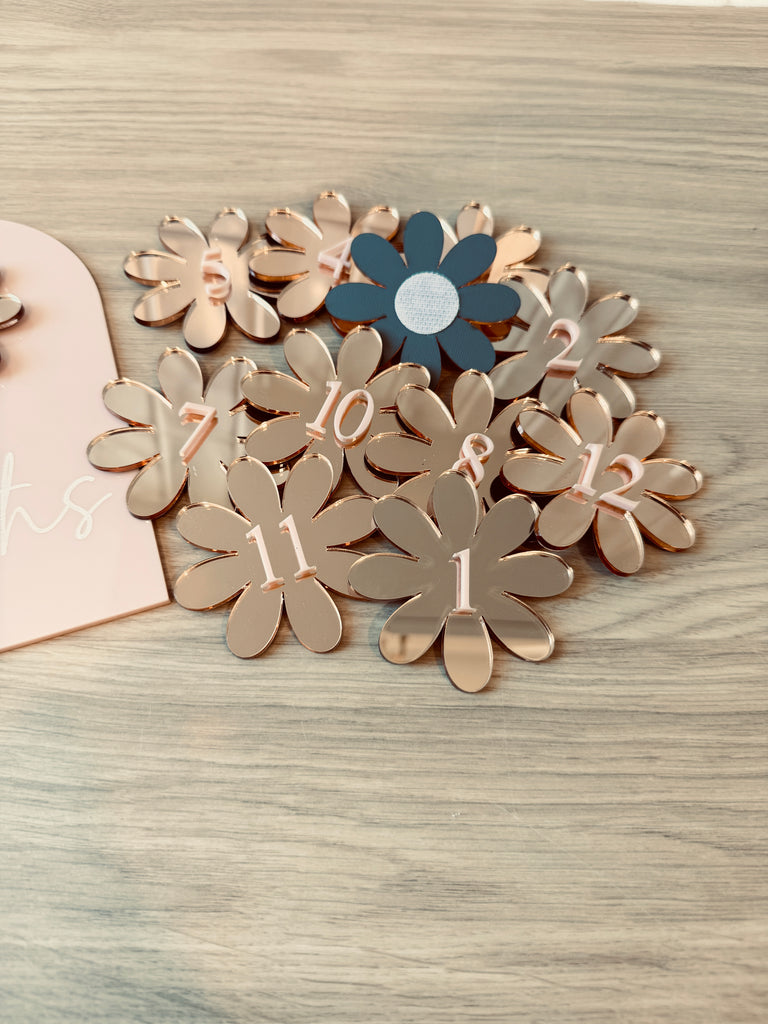 "The Daisy Milestone Set includes a milestone plaque and 12 individual numbers for showcasing your child's monthly milestones. Made with durable, high-quality materials, this set is a charming addition to any nursery or photo shoot. Keep track of your little one's growth with this delightful set."