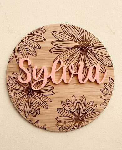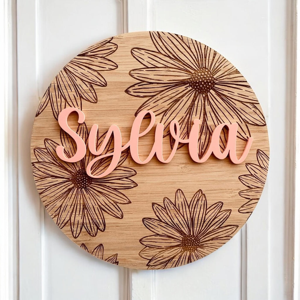 Brighten their space with this charming Personalised Daisy Circle Plaque – featuring delicate engraved daisy florals and a raised acrylic name for a beautiful 3D effect. This round plaque is the perfect blend of natural elegance and custom charm, making it an ideal gift for birthdays, nurseries, or simply to add a special touch to their room.