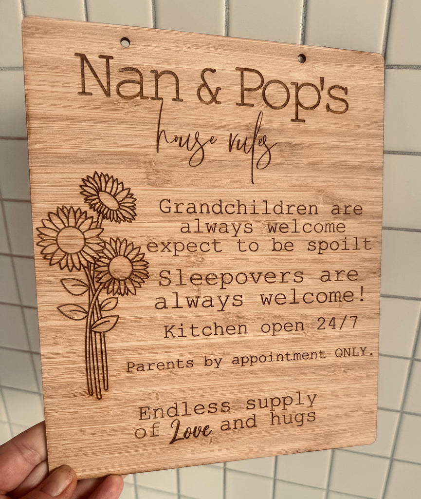 Bring a smile to Nan & Pop’s home with this heartfelt House Rules plaque. Featuring the sweet message “Grandchildren always welcome and spoilt,” this charming sign is a perfect reminder of the love and laughter shared in their home.