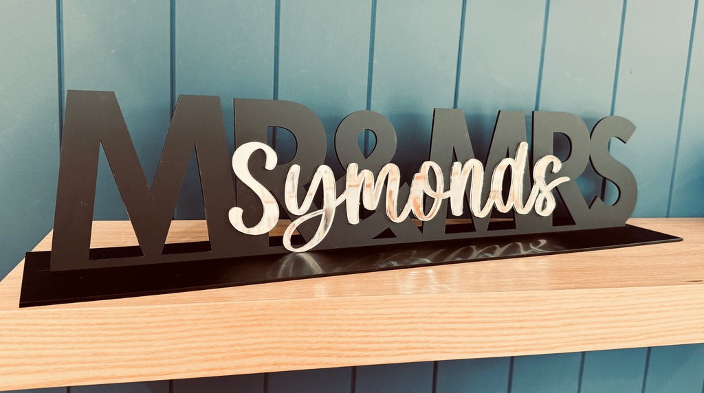 This 60cm table top Mrs and Mrs plaque is the perfect addition to your wedding decor. Featuring a sleek design and stunning stand, it will add a touch of elegance to any table setting. Celebrate your love with this beautiful plaque, designed to be a cherished keepsake for years to come.